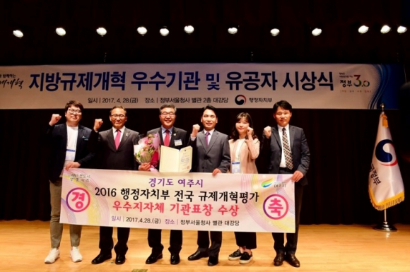 여주시(시장 원경희)는 지난 4월 28일, 행정자치부 주관해 정부서울청사 별관 대강당에서 열린 2016년 지방규제개혁 유공자‧우수지자체 시상식에서 2014년, 2015년에 이어 3년 연속 우수지자체로 선정돼 기관표창을 수상했다고 1일 밝혔다.