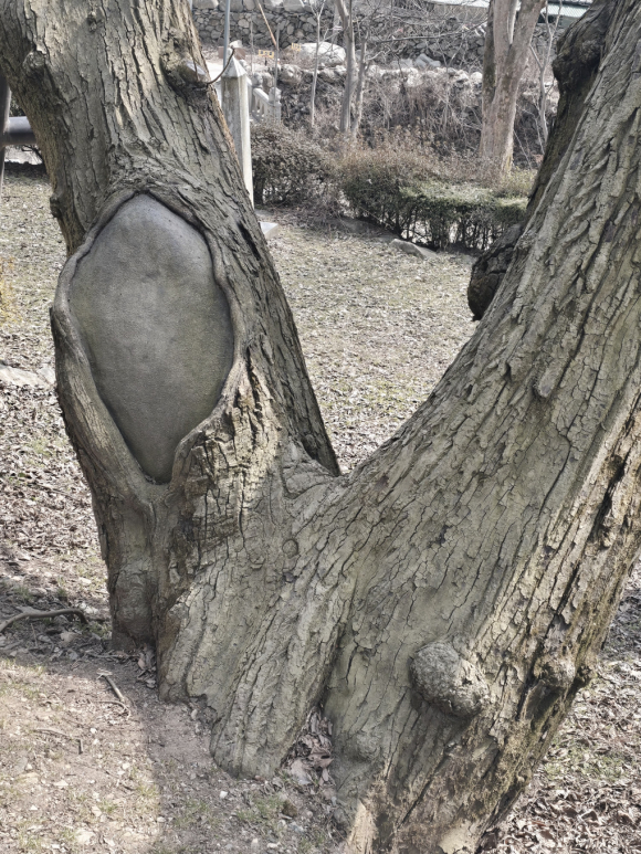 필자가 이 나무를 친견하고자 방문하였을 당시, 호두나무의 우람한 자태는 세월을 지켜온 흔적이 역력했다. 거목 앞에 서면 늘 경이로움이 앞선다. 잠시 우러러보며 고개를 숙여 예를 표한다. 뿌리 쪽부터 우듬지, 가지, 수술 자국, 하늘 향해 두 팔 벌린 마지막까지 그 모습을 마음에 담는다. 그리고 팔을 벌려 나무를 안아본다. 수백 년 호두를 생산하면서 천안의 명물 호두과자를 만들어낸 주역의 모습은 경건하고 우람하다.