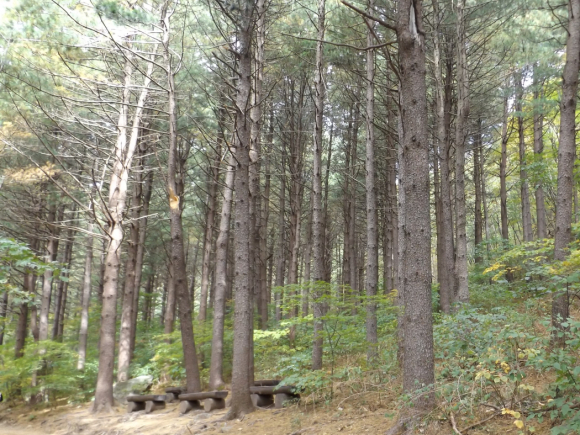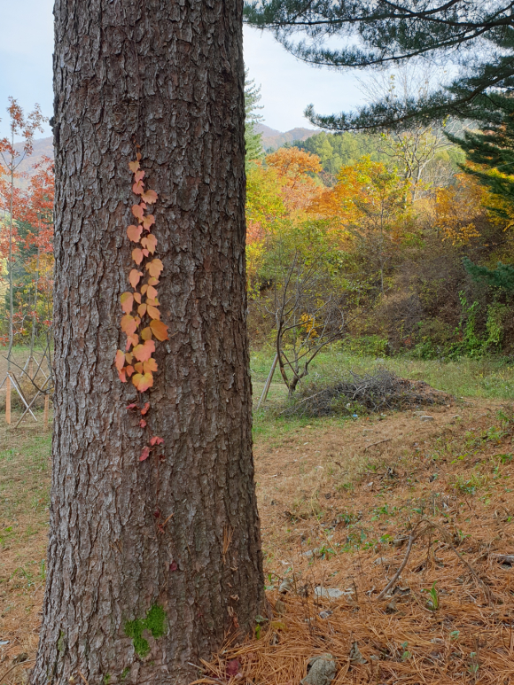 ↑↑ (가을의 잣나무 담쟁이가 나무를 오르고 있다.)