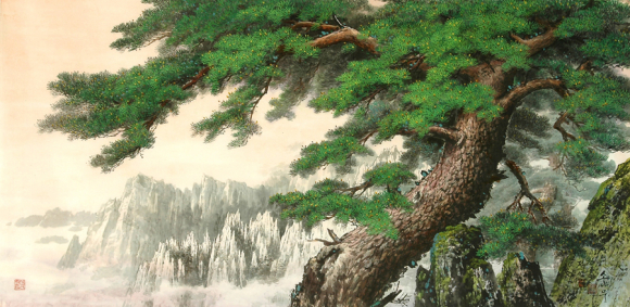 ↑↑ (전통 산수의 형식을 빌려 인공지능이 재구성한 잣나무 이미지. AI 생성 (ChatGPT 활용)