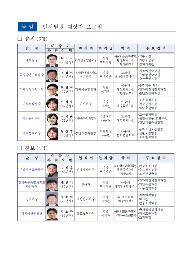 4급 승진 인사로는 ‘깨끗한 경기만들기’, ‘경기도 자원순환마을 운영’ 등 성공적으로 사업을 수행해 온 이태희 자원순환정책팀장이 자산관리과장에, AI콘텐츠 어워즈, 콘텐츠 제작지원 사업 등 각종 콘텐츠사업을 적극 운영해 온 방선영 콘텐츠정책팀장이 종교협력과장에 각각 임명됐다.