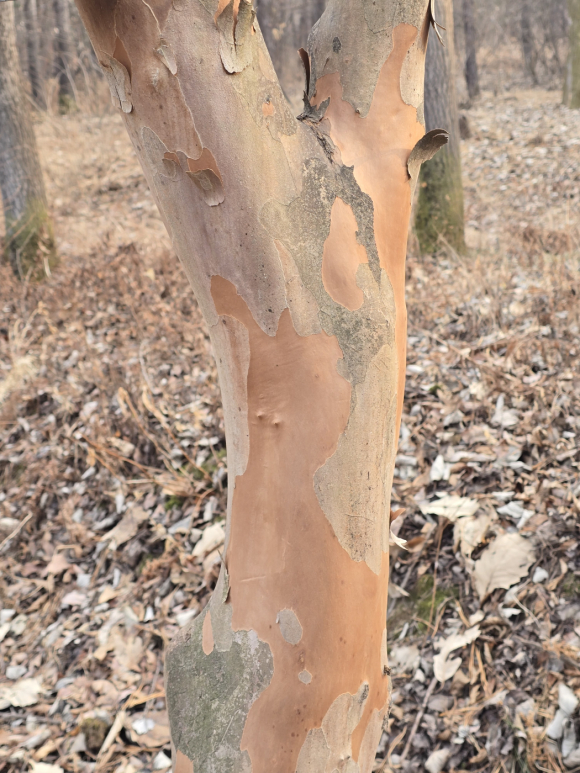 묵직한 존재감으로 서 있는 갈참나무(Quercus aliena)의 깊은 주름은 숲의 안식처가 됩니다. 그 틈은 수많은 생명에게 집이 되고, 보이지 않는 생태계를 떠받칩니다. 진정한 권위는 번쩍이는 외형이 아니라 누군가 기대어 쉴 수 있는 깊이에서 나옵니다. 말이 많지 않아도 좋습니다. 제 자리를 묵묵히 지키는 사람, 타인의 무게를 함께 짊어질 수 있는 사람, 그 사람이 숲의 버팀목입니다. |  | | | ↑↑ ( 반지르르한 윤이 나는 노각나무 수피는 껍질을 벗어야 얻을 수 있다.) | | ⓒ 동부중앙신문 | |