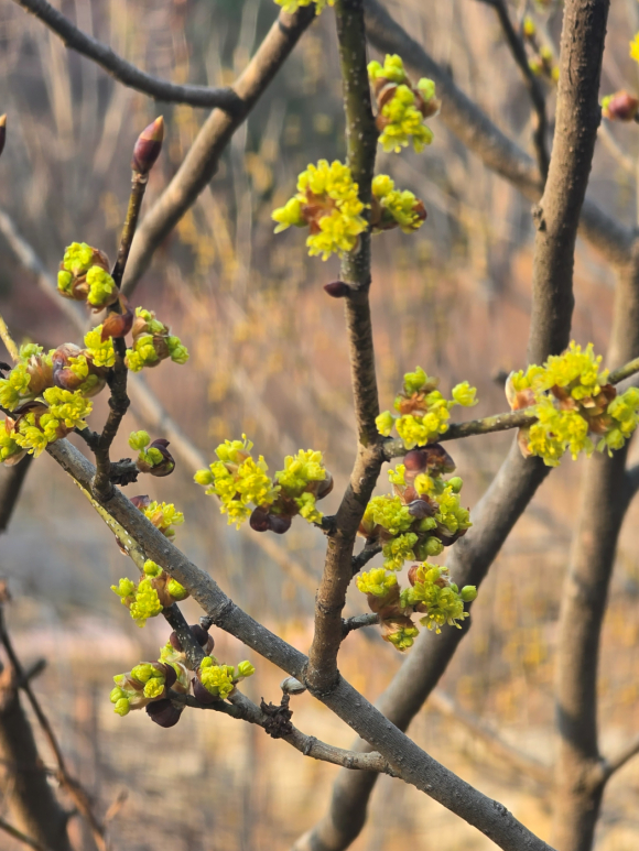 남쪽 지방에서는 동백이 겨울 바다를 붉게 물들이지만, 추운 중부의 산에서는 생강나무가 그 자리를 대신했다. 사람들은 이 나무를 ‘산동백나무’라고 부르기도 했다. 강원도에서는 정겹게 ‘동박나무’라는 이름도 붙였다. 산속에 사는 이들에게 이 꽃은 단순한 풍경이 아니었다. “생강나무가 노랗게 피면 밭을 갈 준비를 한다.” 꽃이 피는 시각이 곧 삶의 시계였고, 자연이 곧 달력이었다. |  | | | ↑↑ ( 산수유꽃을 생강나무꽃으로 착각하기도 한다.) | | ⓒ 동부중앙신문 | |