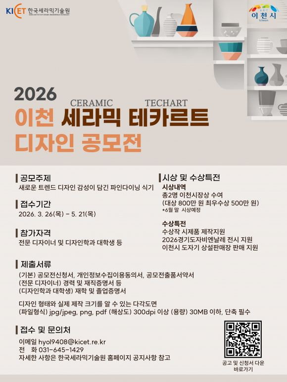 |  | | | ⓒ 동부중앙신문 | | 이천시와 한국세라믹기술원 이천분원은 ‘2026 이천 세라믹 테카르트(Ceramic Techart) 디자인 공모전’을 추진하고 3월 26일부터 5월 21일까지 접수를 진행한다.