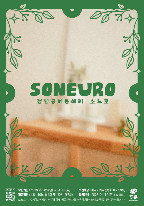 'soneuro(소느로)'는 손으로 직접 만드는 공예 활동을 통해 청년들이 창작의 즐거움을 나누고 서로의 취향과 감각을 공유하는 동아리다. '네트백', '실린더 램프', '라탄 미니 트레이' 등 회차별로 다채로운 공예 작업을 함께 경험하며 일상 속에서 창작이 주는 고요한 집중과 성취의 감각을 발견하는 시간을 갖는다. 신청은 2026. 4. 6.(월) ~ 4. 15.(수)동안 구글폼(https://forms.gle/QVem GJcLdz7FR36x8) 제출을 통해 참여 가능하다. 참여 확정자는 4. 17.(금) 푸릇 블로그를 통해 확인할 수 있으며 해당 활동은 4월부터 10월까지 월별 1회, 총 7회차로 운영된다. 푸릇 관계자는 "소느로 동아리 활동을 통해 청년들이 만들기 체험을 넘어 손의 감각을 통해 스스로를 표현하고 서로와 연결되는 시간이 되길 바라며 창작을 매개로 새로운 관계와 경험을 쌓고 싶은 청년들의 많은 참여를 바란다"고 전했다.