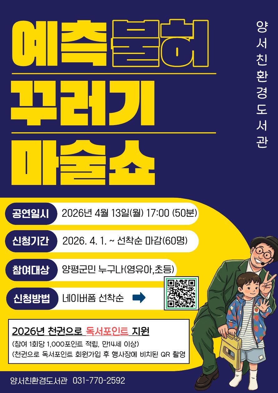 대표 프로그램인 ‘예측불허 꾸러기 마술쇼’는 오는 4월 13일 오후 5시에 개최된다. ‘매직유랑단’이 진행하는 이번 공연은 관객 참여형 마술 체험으로 구성돼 어린이들의 상상력을 자극할 것으로 기대된다. 모집 대상은 보호자를 동반한 관내 영유아 및 초등학생이며, 4월 1일부터 온라인 신청(네이버 폼)을 통해 선착순 60명을 모집한다. 참여자에게는 ‘천권으로 독서 포인트’ 1,000점이 적립된다.