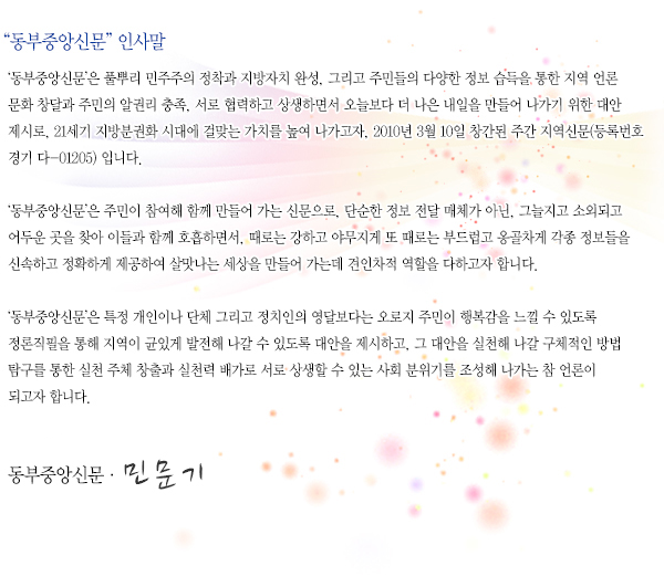 Copyright ⓒ 동부중앙신문 All Rights Reserved. 본지는 신문 윤리강령 및 그 실천요강을 준